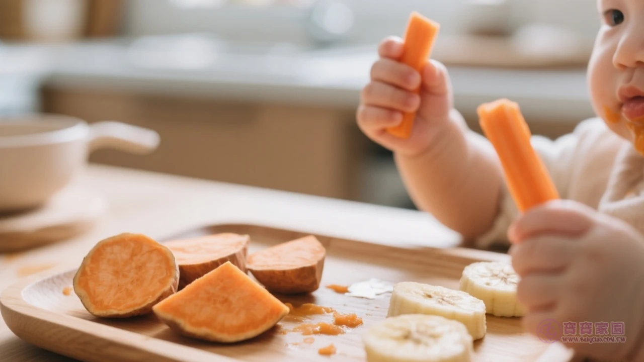 台灣媽咪正讓寶寶嘗試抓握胡蘿蔔條等手指食物