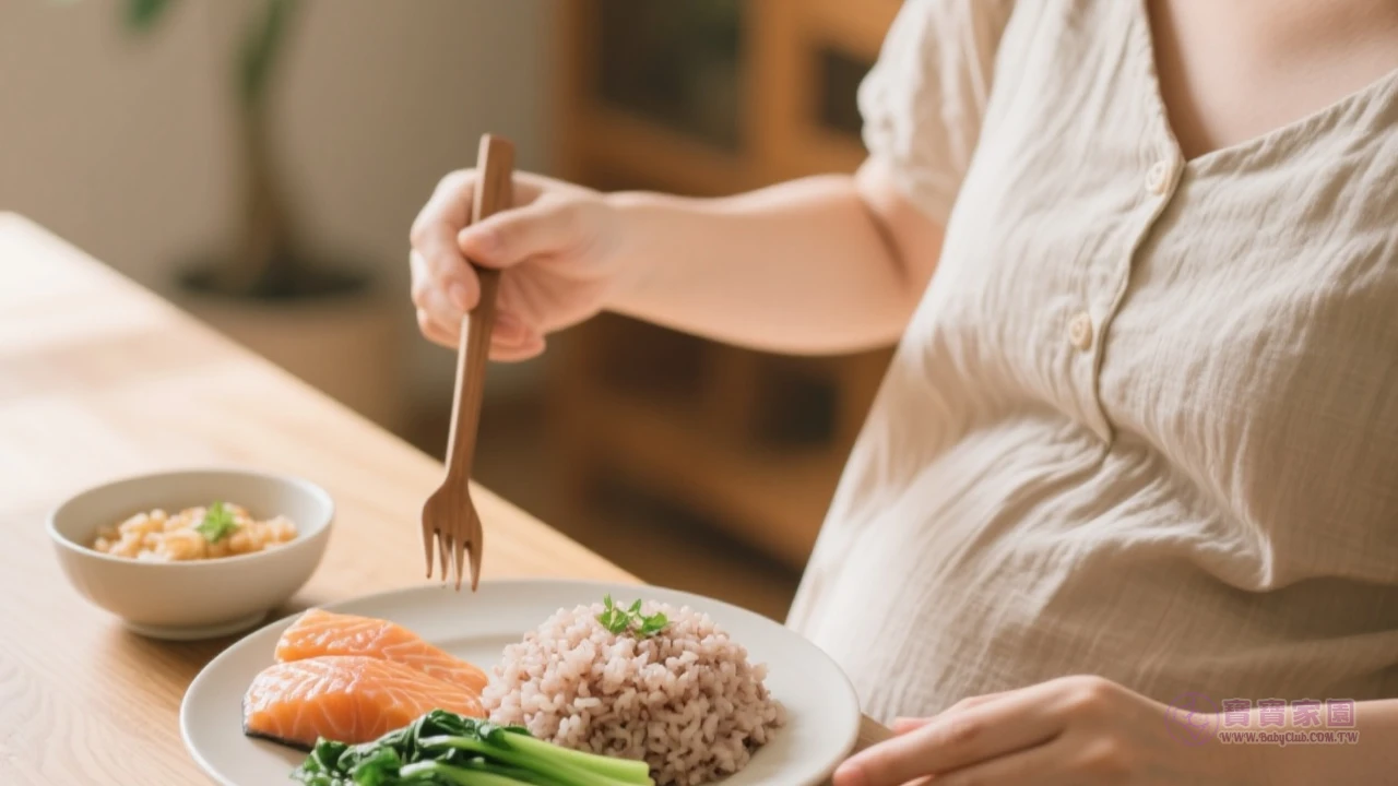 孕婦正在品嚐色彩繽紛的冷食沙拉,木質餐桌自然風格,台灣家庭廚房場景
